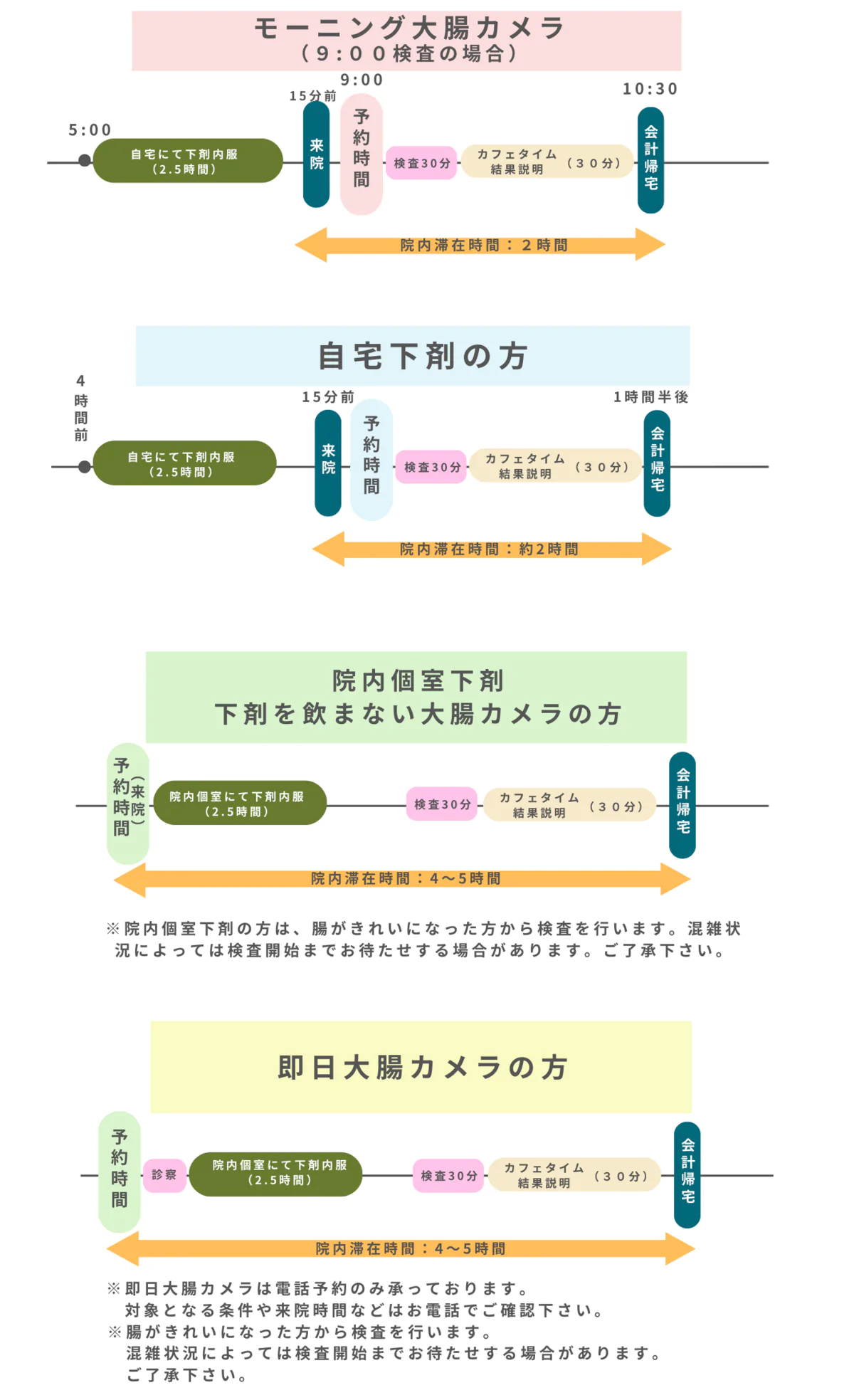 なお、服用した下剤がしっかりと効いて腸内が整うまでの時間や、鎮静剤から完全に目が覚めるまでの時間には個人差があります。そのため、全体の所要時間が前後する可能性があります。検査日はゆとりを持った予定でお越しください。